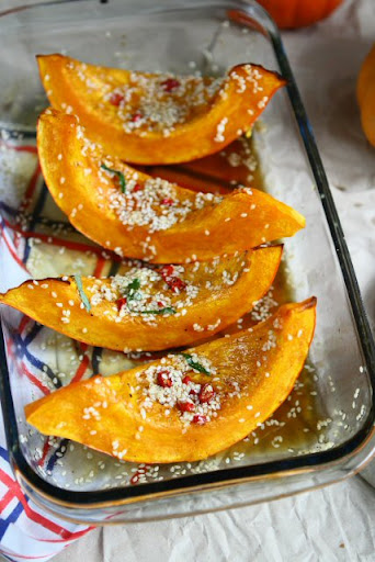 - Place pumpkin wedges in one large baking pan. Sprinkle the pumpkin wedges with a little of salt, pepper and nutmeg, then pour the honey-lemon mixture over. Bake in the hot oven for about 35 minutes.